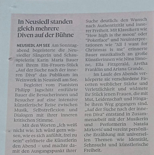 Karin Maria Bauer, Sängerin und Schauspielerin, begibt sich in ihrem eigens entworfenen Ein-Frauen-Stück auf die Suche nach dem eigenen inneren Diva-Anteil und wie dieser uns inspiriert, alles das zu sein, was wir uns wünschen. Die Diva schenkt uns Kraft und Inspiration, alles zu probieren, alles zu leben, alles zu sein.